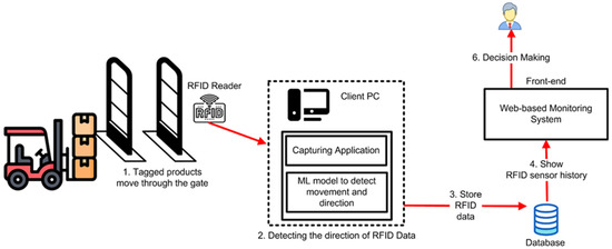 The goal of this study is to create a web-based system that uses a machine learning model to accurately track tagged products and assist management in decision-making. Previous research has shown that this type of system can be useful in web-based traceability [13,17] and disease prediction [39,40]. By employing a prediction model based on machine learning, RFID tags crossing the gate and static or other types of tags movement can be detected accurately.