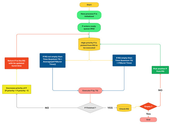 Dynamic time quantum scheduling is a variation of Round Robin (RR) scheduling in which each process is allocated a fixed timespan to complete execution. However, in dynamic time quantum scheduling, the time quantum is not fixed and can vary depending on the behavior of the process [5,6]. For example, if a process uses up its entire time quantum without completing, it is considered CPU-bound and is assigned a more significant time quantum in the next Round. Conversely, if a process completes before its time quantum expires, it is considered I/O-bound and is given a smaller time quantum in the next Round. This approach aims to balance the needs of CPU-bound and I/O-bound processes by ensuring that each process receives a fair share of CPU time. On the other hand, priority scheduling assigns a priority value to each process, and the scheduler selects the process with the highest priority to execute. This approach allows the system to prioritize specific processes over others based on their importance or urgency. For instance, a real-time data-handling process may be prioritized more than a batch-processing process. By combining these two approaches, the scheduler can adapt to the behavior of the process and ensure that essential tasks are executed first while ensuring that all processes receive a fair share of CPU time.