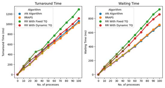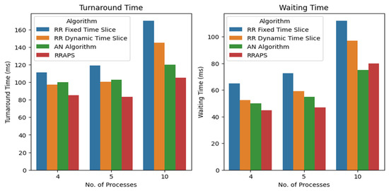 The proposed algorithm is validated on a Core i5 8th generation processor with 16 GB RAM. We developed a simulation tool for evaluating the effectiveness of our RRAPS algorithm in comparison to the conventional Round Robin algorithm in terms of performance. MATLAB 2022b was selected as the programming language for building the simulator due to its graphical representation capabilities. The simulation model receives a quadrant (N, AT, BT, P) as input, where N represents the number of processes, AT is an array that contains the arrival times of each process, BT is an array that contains the burst times of each process, and P is an array that includes the priorities of each process. In our implementation, we introduced a parameter called “decrease_priority”, which determines how much a process’s priority is decreased when it does not complete its execution. Specifically, we set the value of decrease_priority to −1, subtracting it from the process’s priority each time it completes its assigned time quantum without terminating. The RRAPS algorithm computes the waiting and turnaround time of the system with N processes.