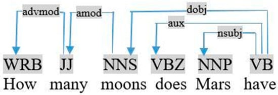 - Many is an adjectival modifier of the followed noun, as shown in the dependency graph of the query «how many moons does Mars have», visualized in Figure 3.