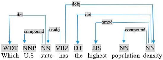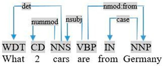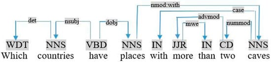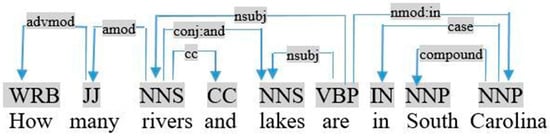 - In the two previous cases, if the followed noun is connected to another noun by conjunction (Structure (S6)), as shown in Figure 5, the object is the sum of the quantities of the two nouns (e.g., count (rivers) + count (lakes)).Figure 5. Graph dependency of the query «how many rivers and lakes are in South Carolina».