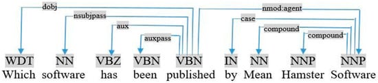 - If the query is in the passive mode, the object is the noun relative by the dependency nsubjpass, as shown in the dependency graph of the query «which software has been published by Mean Hamster Software», visualized in Figure 7.