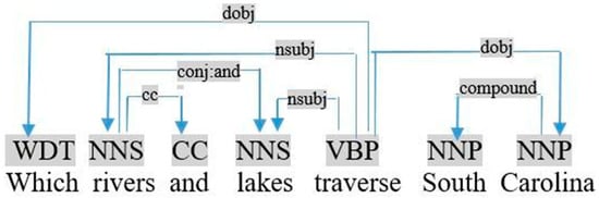 - In the two previous cases, if the noun is connected to another noun by conjunction, as shown in Figure 8, the object is the coordination of two nouns (e.g., rivers and lakes).Figure 8. Graph dependency of the query «which rivers and lakes traverse South Carolina».