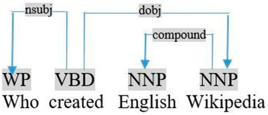 Otherwise, if the question word is subject, followed by the verb (Structure (S4)) and relative by the dependency nsubj, the object is a variable as shown in the dependency graph of the query «who created English Wikipedia», visualized in Figure 9.