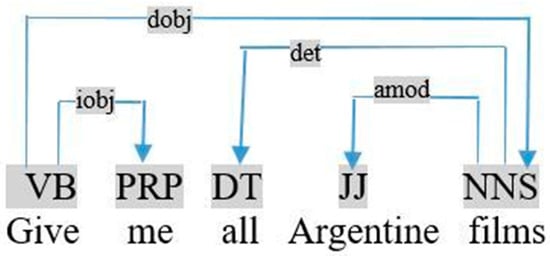 Finally, when the user asks an imperative query (Structure (S5)), the object here is the noun relative by the dependency direct object dobj, as shown in the dependency graph of the query «give me all Argentine films», visualized in Figure 10.