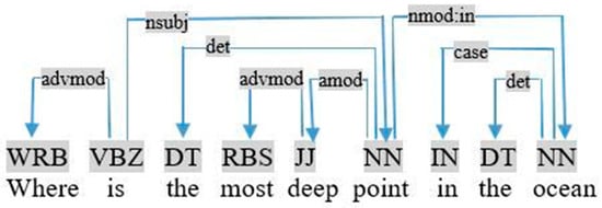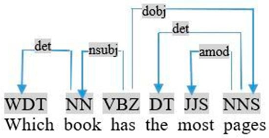While the user does not tell any information about these main parts in the asked query, we must process the syntactic structure of the query in order to infer these parts. However, the process of constructing the query to identify these parts is not a trivial task, especially for complex queries. In this context, we believe that the query interpretation can be performed using the representation of grammatical relations between words in a sentence provided by The Stanford CoreNLP [] which is an NLP tool built by Stanford University and is one of the most widely used natural language analysis tools. CoreNLP enables users to derive linguistic annotations for text, including token and sentence boundaries, parts of speech, named entities, numeric and time values, dependency, and relations, as shown in Figure 2.