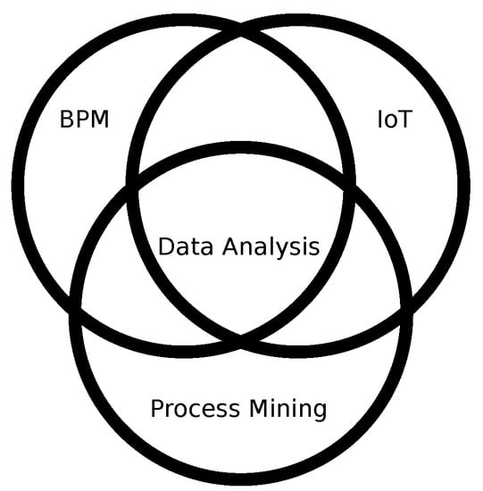 The recent developments and technologies used in the Industrial Internet of Things (IIoT) [] demand a more intelligent and interconnected process-based control of IoT devices []. To achieve a deeper integration with IoT environments in a process-oriented way, Business Process Management (BPM) methods can be applied for control and analysis purposes []. The benefit is that BPM can make use of the huge variety of IoT sensor data that can be used to improve analysis methods. The remainder of this section is structured as follows (see also Figure 1): Section 2.1 discusses relevant IoT terms, and their recognition in the BPM domain. Section 2.2 introduces related work regarding the integration of BPM and IoT in a more general context. Based on that, Section 2.3 describes how process mining techniques can be applied to IoT environments, including the presentation of typical application scenarios. Section 2.4 then describes related approaches that tackle data analysis problems, and provide datasets, which are related to the challenges and solutions described in this paper.
