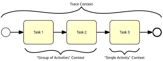 - “Trace” Context: A time-series of sensor readings from at least one sensor is connected to a whole trace. This case is analogous to the “Group of Activities” case. This is for instance necessary when the sensor readings from a period before and/or after individual activities may be relevant for the process analysis. e.g., when enacting a chemical reaction, the characteristics of a warm-up phase might be important for the outcome but might not be explicitly part of the process model, which only starts with adding ingredients.