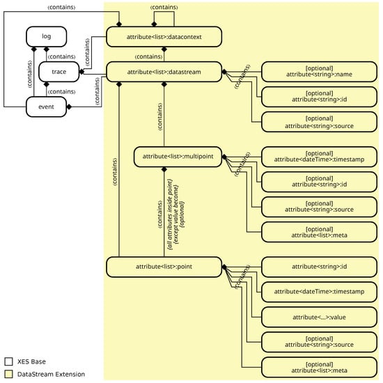 - “Establish a set of named XES attributes to store many (sensor) events per process event.” is achieved by allowing for multiple stream:datastreams and therefore also stream:points to be connected to one process event in the DataStream Metamodel shown in Figure 4. This is also shown in Listings 6–9 where multiple stream:datastreams and/or stream:points are present in one process event. Having a set of common attributes instead of a mix of different attributes with slightly different meaning, reduces data transformation effort, and provides context and meaning to the most basic shared concepts.
