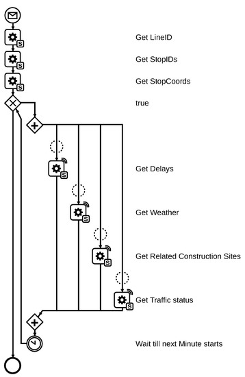 For efficient planning of public transportation services, knowledge about the operation of individual tram lines as well as information about effects which might influence its smooth execution, such as weather or traffic, is needed. The dataset (https://doi.org/10.5281/zenodo.7411234 (accessed on 8 February 2023)) used for this section provides an example for the collection of such data in Vienna, Austria using (1) the API of the “Wiener Linien” (the company providing public transport in Vienna), (2) a weather API, and (3) the TomTom navigation system to monitor traffic. Data from these different sources is then collected by enacting a process in an execution engine and stored in the log using the proposed XES DataStream extension format. Using this information, the correlation between delays of individual tramways with the weather and traffic conditions near the track of the observed line can be investigated. This can then lead to better planning for smart city scenarios concerning traffic control in general or suggestions leading to an improvement of the public transportation system. Collecting data for the before mentioned scenario is done by enacting a process model using the cpee.org process execution engine. The process retrieves the individual data for weather, traffic, or tram line(s) (per endpoint providing the data) in parallel and then waits until the next minute starts to repeat the data collection.