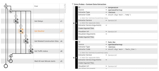 The process model in Figure 5 contains tasks that are responsible for the collection of data, which is signalized by the two curved lines on the top right side of these tasks. Such tasks contain a description of the data probes [], which define how collected data is added to the log, as shown in Figure 6 and Figure 7. These examples show how different kinds of data (in this case derived from the return value of the service invoked in this task) are extracted. It is possible to extract data in different ways, e.g., split data into multiple single data points (as shown in Figure 6) or create multiple data streams (as shown in Figure 7).