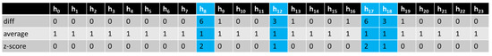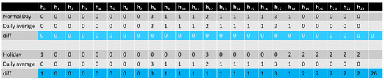 We know that there are 24 h in a day. Suppose all consecutive hour numbers are subtracted in pairs, and the numbers obtained in sequence are defined as DiffH0, DiffH1, DiffH2, …, DiffH22, DiffH23. The period with a massive change in the day will correspond to those values with higher absolute values among the 24 numbers (as shown in Figure 1). Whether it is more or less, it indicates abnormal changes. Therefore, by finding the extreme values in these numbers, one can obtain the abnormal change period in the day. If these periods are encountered during modeling calculations, the formulas mentioned in Important Rule 2 should be used instead.