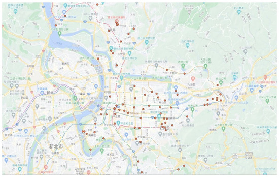From the open data of parking information in Taipei City (Retrieved 10 November 2021, from https://data.taipei/), two random samplings of weekday data of about three weeks were selected (as shown in Table 1), and 80 parking lots with more than 300 parking spaces were selected as observation objects. The parking lot locations can be seen in Figure 4 below. The chosen parking lot locations are evenly distributed in the city and are of various types and backgrounds. There is no problem with sampling bias.