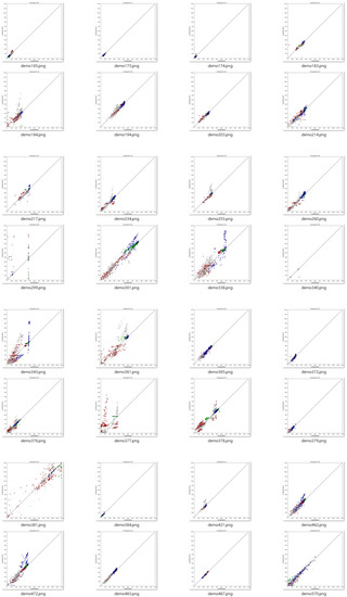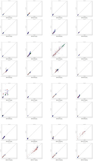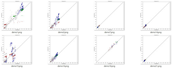 We use regression analysis to see how closely the actual and predicted values are correlated. Among the 80 cases of parking lots that were counted, 64 records have an R2 of more than 0.7 and 10 have an R2 of less than 0.5. Overall, the estimated model is valid for more than 80% of the fields, and 42% have R2 above 0.9. The R2 value of each field can be seen in Table 4 below, and the distribution pattern can be seen in the thumbnail (as shown in Figure 5). It can be found that in most cases, the predicted value is close to the actual value, so the points on the graph move closer to the regression line. However, there are still a few cases where the graph exhibits anomalous scatter.