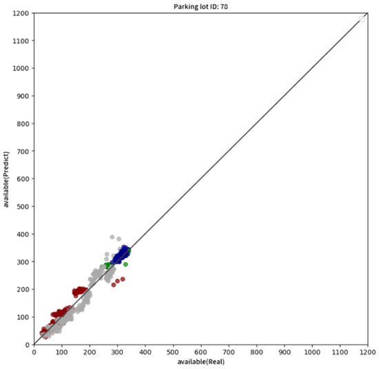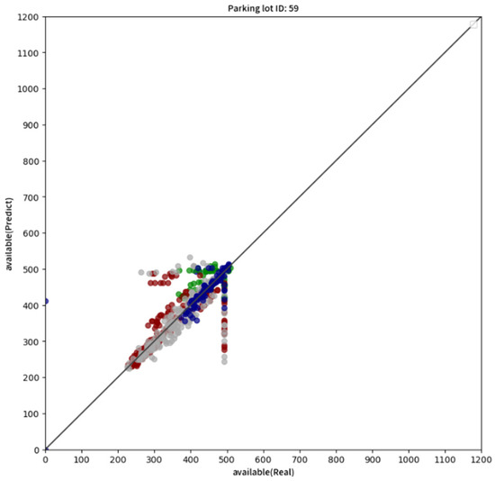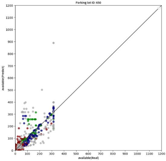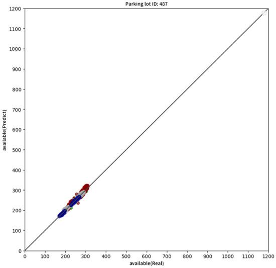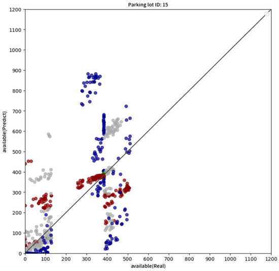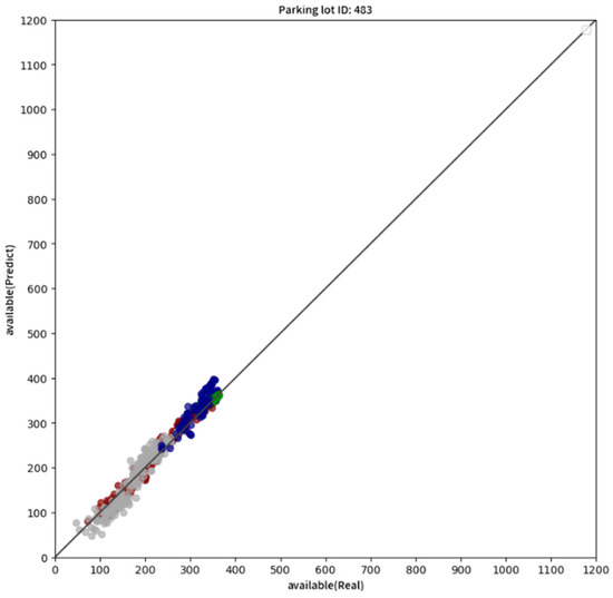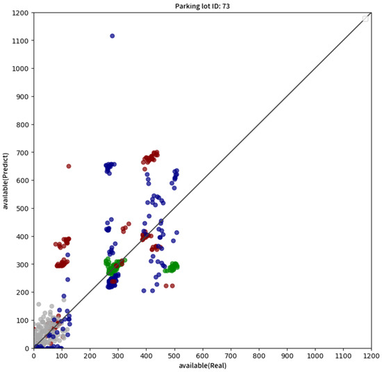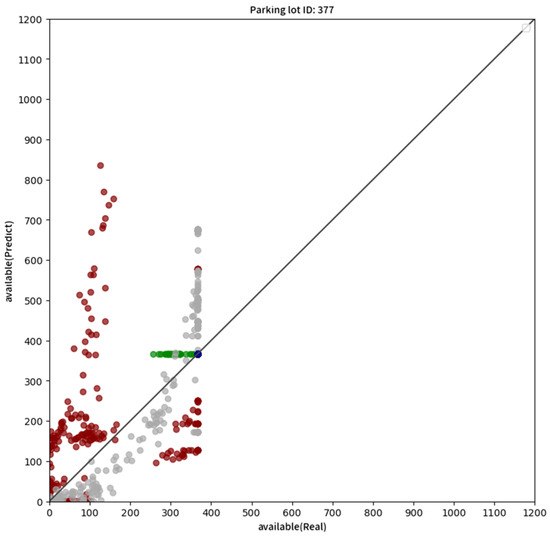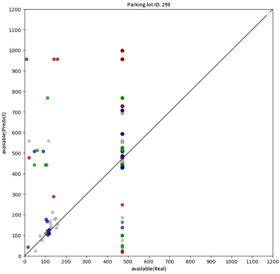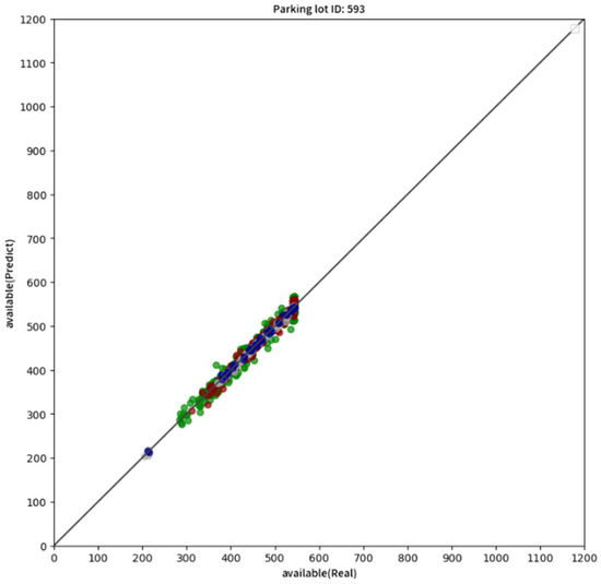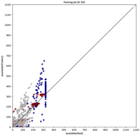 Usually, this means that the parking lot may be disconnected at some point, and the number of disconnections will be fixed. In this case, the actual number will permanently be fixed since the number of available parking spaces will not change. However, since the prediction will still be estimated according to the normal situation, the calculated result will have an extensive variation range, so it is displayed as a straight line (case 299, Figure 10) on the graph. In addition, if the parking lot is only closed for a certain period in a day, and the number at the time of closing is a fixed value, a straight line still appears on the graph, but the points cluster more closely (case 585, Figure 11).