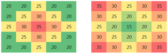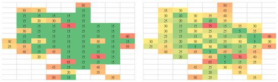 The following two diagrams are both composed of 25 small areas (Figure 17). The numbers in the figure represent the hourly parking fees in the area. As each area’s price is different, drivers will usually park at nearby places with low prices. Therefore, with the joint control of regional prices, it will be possible to control the parking behavior in the region, trying to concentrate or move it, and thereby achieve the possibility of evacuating parking hotspots or creating emerging urban areas.