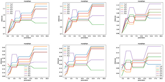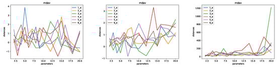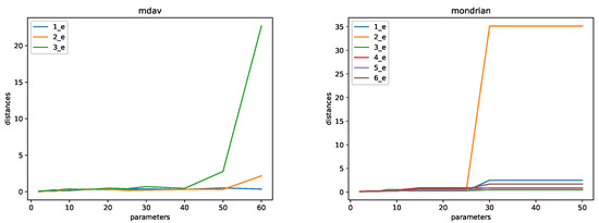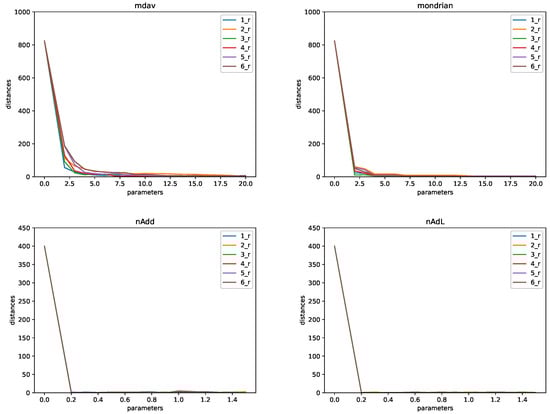 - Microaggregation (MDAV and Mondrian). The following values of k were considered: . For some experiments, we used larger values. In that case, we used , 20, 25, 30, 40, 50, 60, 70, 100, 200, 300, 400, .