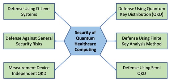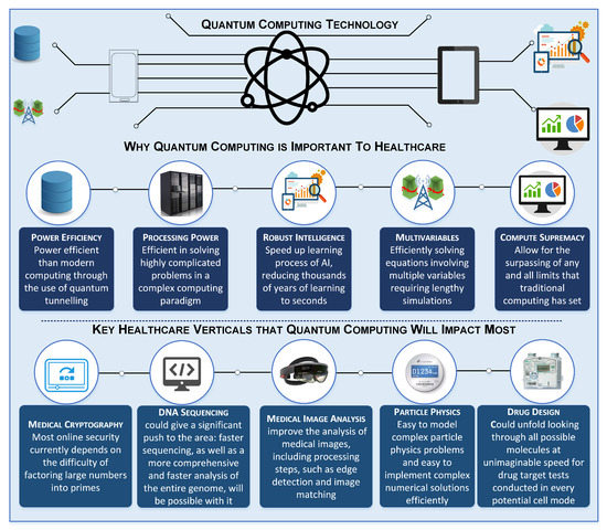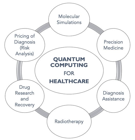 QC is particularly well-suited to numerous compute-intensive applications of healthcare [1], especially in the current highly connected Internet of Things (IoT) digital healthcare paradigm [2,3], which encompasses interconnected medical devices (such as medical sensors) that may be connected to the Internet or the cloud. The massive increase in computational capacity is not only beneficial for healthcare IoT but can allow quantum computers to enable fundamental breakthroughs in this domain. When we leap from bits to qubits, it could improve healthcare pharmaceutical research [4], which includes analyzing the folding of proteins, determining how molecular structures, for instance, drugs and enzymes, fit together [5], determining strengths of binding interactions between a single biomolecule, for example, protein or DNA, and its ligand/binding partner such as a drug or inhibitor [6], and accelerating the process of clinical trials [7]. A few potential applications are briefly described next for an illustration. A quantum computer can perform extremely fast DNA sequencing, which opens the possibility for personalized medicine. It can enable the development of new therapies and medicines through detailed modeling. Quantum computers have the potential to create efficient imaging systems that can provide clinicians with enhanced fine-grained clarity in real time. Moreover, it can solve complex optimization problems involved in devising an optimal radiation plan that is targeted at killing cancerous cells without damaging the surrounding healthy tissues. QC is set to enable the study of molecular interactions at the lowest possible level, paving the pathway to drug discovery and medical research. Whole-genome sequencing is a time-demanding task, but with the help of qubits, whole-genome sequencing and analytics could be implemented in a limited amount of time. QC can revolutionize the healthcare system through modern ways of enabling on-demand computing, redefining security for medical data, predicting chronic diseases, and accurate drug discoveries.
