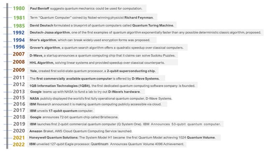 The term quantum computing was first coined by Richard Feynman in 1981 and has since had a rich intellectual history. Figure 3 depicts a timeline of major events in this area. Noteworthy in the timeline is that while there were somewhat larger gaps between events earlier on, recently, the field has started experiencing a more rapid series of developments. For example service providers have begun offering niche quantum computing products, as well as quantum cloud computing services (e.g., Amazon Braket). Recently, Google’s 54-qubit computer accomplished a task in merely 200 s that was estimated to take around over 10,000 years on a classical computing system [44]. Nevertheless, quantum computing is still in its infancy stages, and it will take some time before quantum computing chips reach desktops or handhelds. An important factor inhibiting the commoditization of quantum computing is the fact that controlling quantum effects is a delicate process, and any noise (e.g., stray heat) can flip 1s or 0s and disrupt quantum effects, such as superposition. This requires qubits to be fully operated under special conditions, such as very cold temperatures, sometimes very close to absolute zero. This also motivates research exploring fault-tolerant quantum computing [45]. Considering this fast-paced development of quantum computing, this is an opportune time for healthcare researchers and practitioners to investigate its benefits to healthcare systems.