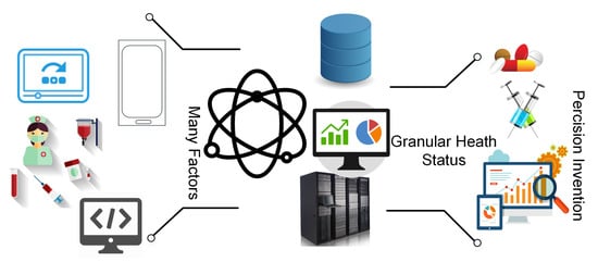 Precision medicine has the goal of identifying and explaining relationships among causes and treatments and predicting the next course of action at an individual level. Traditional diagnosis based on the patient’s reported symptoms results in umbrella diagnoses, where the related treatments tend to sometimes fail [57]. Quantum computing could help in utilizing continuous data streams using personalized interventions in predicting diseases and allowing relevant treatments. Quantum-enhanced predictive medicine optimizes and personalizes healthcare services using continuous care [58]. Patient adherence and engagement at individual-level treatments could be supported by quantum-enhanced modeling. A use case of quantum-computing-based precision medicine is illustrated in Figure 5.