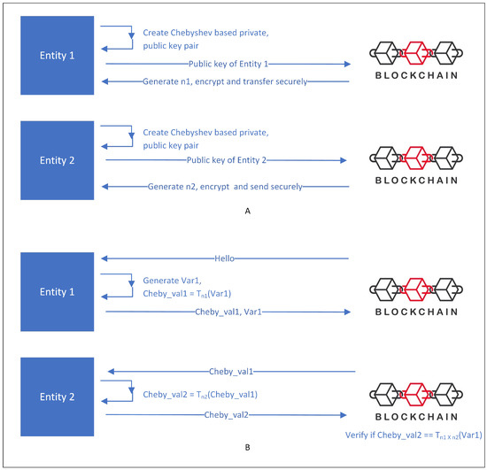 This semigroup property of the Chebyshev polynomial shown in Equation (4) can be used in cryptography to encrypt and decrypt the message m using ElGamal’s public key cryptosystem. To securely receive a message, Alice will generate a large integer ska, another number x, and compute . is the Chebyshev polynomial value for Alice. For her, will be her public key, whereas ska will act as her private key. Let us assume Bob wants to send a message (m) to Alice. He will generate a large integer skb, compute , and then . Bob will also compute M as . Bob is now ready to send cipher text C to Alice in the form of . When Alice receives cipher text C, she computes using the formula . She can then decrypt message m by dividing cipher text C with . In the proposed group authentication mechanism, we used this Chebyshev polynomial-based cryptosystem along with Blockchain technology to facilitate the group authentication for IoT devices situated in different geographic locations under different authorities. Figure 1 shows the overall general working principle of the proposed scheme, which shows how the Chebyshev polynomial can be used for two entities. Authentication can be divided into two parts. Each entity, such as an IoT device, will use a Chebyshev polynomial with a pre-determined degree. In the first part, the degree of the Chebyshev polynomial is securely shared with corresponding entities using a smart contract as shown in Figure 1A. The second part deals with group authentication as shown in Figure 1B. The first entity computes Cheby_val1 using degree n1 previously sent to it and a generated variable var1. Entity 1 will send Cheby_val1 and var1 to the smart contract. Once the smart contract receives these values, it will send Cheby_val1 to entity 2. Upon receiving Cheby_val1, the entity will compute Cheby_val2 using Cheby_val1 and n2. Entity 2 will send Cheby_val2 to the smart contract where it will verify the group membership by comparing Cheby_val2 with its computation as shown in the figure. The same procedure can be carried out for more than two entities in a sequential manner.