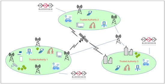 The proposed group authorization framework is inspired by the semigroup property of the Chebyshev polynomial and integrates the smart contract feature of Blockchain technology. Figure 2 shows the network diagram of one use case for the proposed group authentication framework. It shows the applicability of the security framework where there may be different industries/smart cities and some of their IoT devices want to communicate with each other. In the given example, there are three different TAs located at different geographic locations. These TAs can be as large as smart cities or as small as industrial environments. There are many IoT devices located at each premise. Each TA is also connected to one node of the Blockchain. This Blockchain can be a community Blockchain, private Blockchain, or a public Blockchain, depending on the understanding of participating TAs.