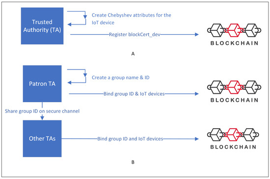 The first phase deals with preparing the IoT devices and Blockchain for group formation as shown in Figure 4. In part A of phase 1, all participating TAs will register their IoT devices on the Blockchain. In this part, a TA will generate the Chebyshev attributes, such as the required degree of the Chebyshev polynomial and the value of variable x, and compute the public key as explained in the previous section. The public key of each IoT device is stored by each TA on Blockchain in the form of a digital certificate named blockCert_dev, along with other essential metadata, such as , TA name, device name, device type, etc. A PUF is used to create a unique identifier (known as ) for an IoT device. In part B of phase 1, one TA (known as patron TA) will initiate the group formation process. The patron TA will create a group name and identifier. The patron TA then identifies the of the participating IoT devices and binds these IDs with the group ID using a function bindGroup of the smart contract. After this, the patron TA will share the group name and group ID with all the participating TAs on a secure channel. All of the remaining participating TAs will also use bindGroup of the smart contract to bind their IoT devices with the supplied group ID. After the successful execution of the first phase, the smart contract will have information, such as group name, group ID, and list of all participating IoT devices. At the end of this phase, the public keys of all participating IoT devices are also stored in Blockchain.