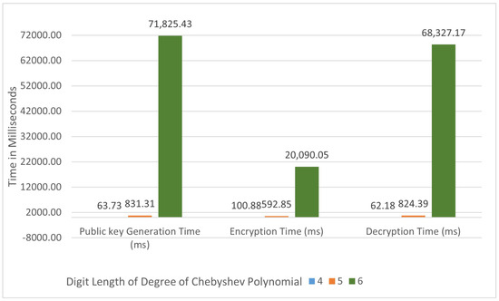 From the figure, it is evident that as the digit length increases, the time taken to generate a public key, encrypt, and decrypt also increases. For a digit length of 1, which means a polynomial degree in a single digit (i.e., a linear equation), the times taken to generate a public key, encrypt, and decrypt are 0.502 ms, 0.226 ms, and 0.112 ms, respectively. For double-digit polynomial degrees, these times are 0.870 ms, 0.737 ms, and 0.512 ms, respectively. If the degree of the Chebyshev polynomial is increased to 3, the time taken to generate a public key, encrypt, and decrypt is found to be 9.927 ms, 8.993 ms, and 9.752 ms, respectively.