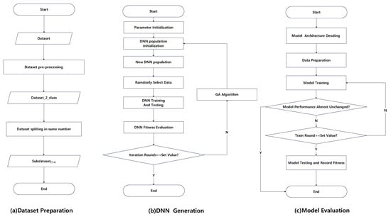 The method proposed in this paper is mainly divided into three parts: dataset preparation, model generation and model evaluation. The purpose of data preparation is to reduce the time consumed by the model and ensure the evaluation’s objectivity. The model generation part randomly generates a DNN population at the beginning and it improves the performance of the DNN population through continuous iteration of the GA until the qualified model appears or the number of iteration rounds reaches the set value. The model evaluation part decodes the corresponding sequence of the model architecture generated by the GA and trains the model after decoding. To reduce the resources consumed by the model evaluation, the model training is stopped early according to the model performance changes. Finally, the model is evaluated and the model’s fitness is recorded. A flowchart of the proposed method is shown in Figure 1. The flowchart has three parts from left to right: the first part shows the process of dataset preparation, the second part shows the process of the model generation method proposed in this paper and the third part shows the evaluation process of the generated model.