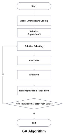 The limitation of the existing research is that only the GA is used to optimize the model’s hyperparameters or select the data features [,]. These are not the main factors that determine the performance of the model [,]. The main factor that determines the performance of the model is the architecture of the model []. Although, in previous works, some researchers have used GAs to adjust the architecture of the model, the search space of the GA needs to be bigger and the fitness function needs to consider the model’s running time. The method proposed in this paper solves these problems.
