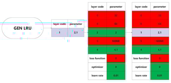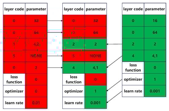 In this paper, strings are used to represent the architecture of a DNN, the activation function, the loss function and the optimizer [] and numbers are used to represent the learning rate. Table 2 shows the DNN layer used in this paper, the parameters related to the DNN layer and their coding methods. Table 3 shows the activation function, loss function, optimizer and corresponding codes used in this article. In addition, this paper uses unequal-length coding to represent the architecture of the model. To ensure the performance of the model, the number of layers of the model is limited to 3–12 layers. To more clearly show the DNN architecture and its related parameters after coding, Table 4 shows the sequence corresponding to a five-layer DNN. It corresponds to a list containing strings and numbers.