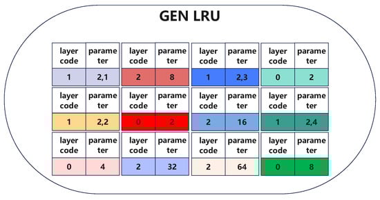 Since the random mutation may cause the average fitness of the population to decrease, this paper sets up a GEN (Gene) LRU (Least Recently Used) to alleviate this situation. After each solution in the set calculates the fitness, the solution with the top 20% of the fitness is selected and its gene fragments are shuffled and stored in the GEN LRU. Before the start of each solution’s mutation operation, a random value ∈ [0,1] is generated. If the randomly generated number is lower than the preset threshold value = 0.5 ( can be set in this way to ensure the stability of the average performance of the population), the child solution randomly selects a fragment from the GEN LRU as a replacement and the child solution performs a random mutation. The GEN LRU is shown in Figure 4, where different colors represent different gene fragments. A mutation of one solution is shown in Figure 5.