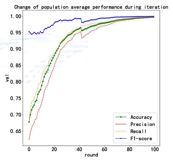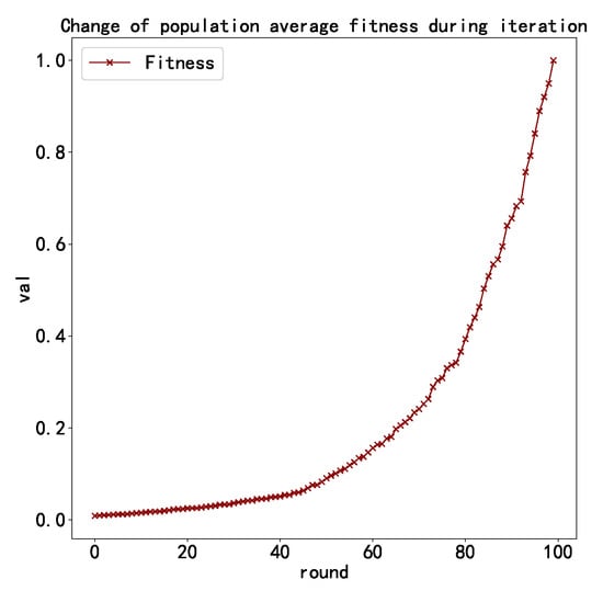 The abscissa represents the number of rounds of iteration and the ordinate represents the model’s average performance or average fitness changes with the number of rounds. Figure 6 shows the average performance of the population in the iteration process. Figure 7 shows that the normalized average fitness continues to improve in the iterative process, indicating that the model is making continuous progress in accuracy and running time. Since the growth speed of the fitness function set in this paper will increase with the increase in accuracy, the curve in Figure 7 does not show a trend of slower growth. Moreover, under the condition that the accuracy is almost constant in the later stage, the continuous reduction in the running time of the model also greatly affects the change in the average fitness of the population.