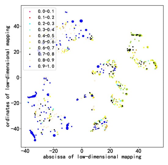 This paper also found that models with similar performance have a certain architectural similarity. Figure 9 shows that the coding corresponding to the DNN architecture is reduced to two dimensions by t-SNE. The abscissa and ordinate correspond to the distribution of the coding corresponding to the DNN architecture in two-dimensional space. In this paper, the model’s fitness is normalized and the legend in the upper left corner shows the colors corresponding to the low-dimensional mapping of DNN architecture coding in different fitness ranges. It can be found that the low-dimensional maps of the DNN architecture’s coding have a fitness between 0.9 and 1.0 and are clustered together, indicating that DNN models with good performance may have similar architectures.