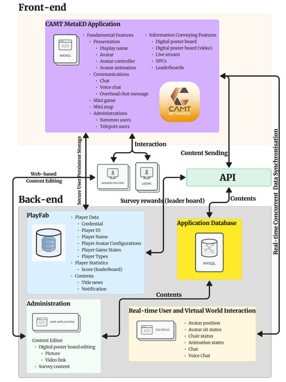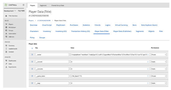 The platform’s architecture design, shown in Figure 1, was based on the gathered requirements and features a front-end named CAMT MetaEd, which is accessible by both end-users and administrators. The front-end application was developed using Unity for deployment on a WebGL platform for easy accessibility by any web browser [2]. The Unity game engine was adopted because it has a good reputation in cross-platform development. In other words, the developed application can be easily imported to other platform devices, such as VR, AR, mobile, and standalone applications. The front-end was connected to the Playfab as the back-end service [51], where the user credentials, user personalisation data such as avatar configurations, and user statistics are stored. The Playfab back-end service was chosen for several reasons. It has a well-documented use as a standard form of data storage, i.e., Java Script Object Notation (JSON) [52]. It is rich in features for this particular type of back-end service. For example, it has a secure server-side cloud function for virtual money transactions. It is scalable. Figure 2 shows an example screenshot of the use of the Playfab back-end to store user data. At the lower right of Figure 1, the state-of-the-art Colyseus real-time online multiplayer distributed engine can be seen [53]. This is used for real-time data synchronisation by concurrent online users. The engine is scalable to support thousands of concurrent users, which is essential for the metaverse. The application database serves as the metaverse content server on which the virtual world information is stored and can be retrieved via the provided application programming interface (API). It can be managed by an administrator through a web-based application, shown in the lower left of Figure 1. From a list of key metaverse features in Table 1, Table 2 shows the corresponding features implemented in this study.