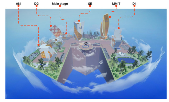 The purpose of the open-house event was to provide information to outside visitors who visit the College of Arts, Media and Technology (CAMT), Chiang Mai University, Thailand. The focus was to showcase the college’s curricula to prospective students. There are five programs at the college: Animation and Visual Effects (ANI), Digital Games (DG), Software Engineering (SE), Modern Management Information Technology (MMIT), and Digital Industry Integration (DII). The content of the metaverse was created based on these curricula by gathering information from the lecturers who manage each program.