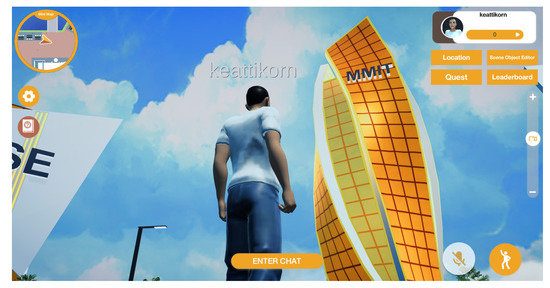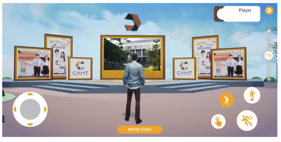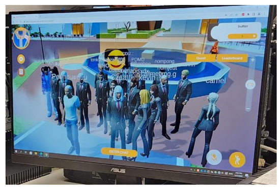 The deployment of the metaverse on a WebGL platform made the preparation process relatively simple. Compatible web browsers were pre-installed in computer laboratory rooms at the university, and a short URL link was created for easy access (https://cmu.to/meta accessed on 14 February 2023).