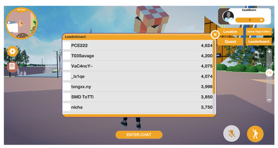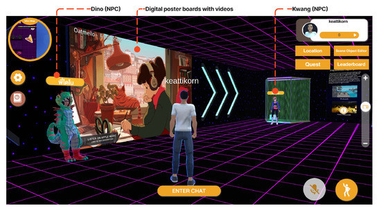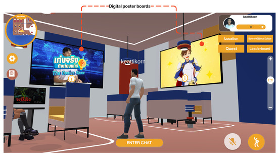 The platform provides various methods and features for conveying information to its users, as summarised in Table 3. A digital poster board is a simple tool that users can interact with to access more detailed information, as shown in Figure 8. Additionally, digital posters can be used to display either a static video or a live video for a more immersive experience (Figure 9). Throughout the metaverse, there are non-player characters (NPCs) that users can interact with, initiating a conversation (Figure 10). Some NPCs provide general information, while others offer tasks or quests for users to complete within the metaverse. This incentivises exploration and promotes the platform’s goal of conveying informational content. Upon completion of a quest, users are rewarded with scores based on their performance, which can be stored in a cloud service and displayed on a leaderboard [51] (Figure 11). This can be seen from the main stage when there is a live event (Figure 12). This can enhance engagement and encourage competition among users.