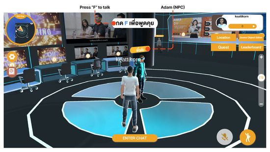 - Visitors were able to interact with information-conveying methods designed for each study program inside the buildings. Some of these methods provided additional points to users, such as answering short questions presented by NPCs about the curriculum and viewing informational digital poster boards for a certain amount of time.