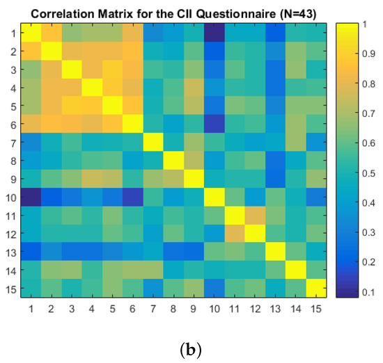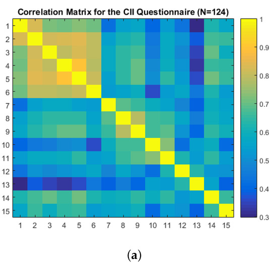 A correlation matrix of the CII-N124 questionnaire is represented by a heat-map plot, as shown in Figure 16a. An area with a highly positive correlation is the area between the 1st and the 6th questions, as indicated by the yellow colour on the map. A heat-map plot of the CII-N43 questionnaire is shown in Figure 16b. The first six questions still followed the same trends, i.e., a positive correlation was found. However, the 10th question item (CII-10) is low in comparison with the first 6 questions, while the 13th question shows a moderately low correlation compared to the 1st–9th questions.
