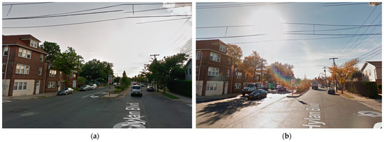 (a) Google Street View taken in Queens, NYC, in November 2016; (b) Google Street View taken at the same location in July 2017.