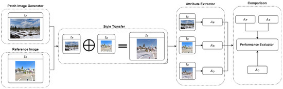 Figure 2 illustrates the proposed framework, which is composed of the following components: patch image generator, reference image, style transfer, attribute extractor, and comparison. The fundamental idea was to generate a synthesis view for the reference images, such as Google Street View, with lower updating frequency by transferring the style from patch images, which contain the latest weather/season information from an external data source, such as Flickr [30]. Flickr is an online photo management and sharing application that covers various images with different lighting and weather from anywhere in the world. Most importantly, the large number of active users ensures that the image database is updated at a very high frequency. Once we obtain the qualified patch images by providing a time frame and a geo-location near the desired reference images, we can pass patch images and reference images to the style transfer component to produce an image that contains the features from both images. The auxiliary deep learning model contains an attribute extractor, which can recognize the scenes when the model is given images. The attribute extractor then produces a set of attributes to best describe the images. The set of attributes is then passed to the comparison component with the performance evaluator to determine the results of the attributes extracted and transferred.