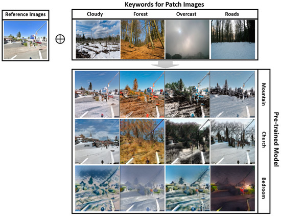In the case of a swapping autoencoder proposed in the paper [13], the network was trained to reconstruct an image by first encoding it into a compact representation, called a latent code, and then decoding the latent code back into an image. The key difference with a swapping autoencoder is that the network is trained to swap the latent codes between two images and then decode the swapped codes to produce a new image. This allows the network to transfer the style or appearance of one image to another. There are three pre-trained models provided in [13], i.e., the mountain model, the church model, and the bedroom model, which are trained by LSUN Church, Bedroom [31], and Flickr Mountains, respectively. Figure 4 shows the view synthesis results when we attempted to transfer the weather/light information extracted from a forest image to a Google Street View Image with each pre-trained model.