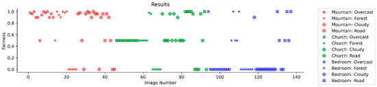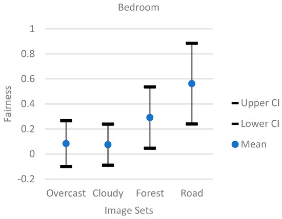 Additionally, Figure 7, Figure 8 and Figure 9 showed a 95% confidence interval graph for each individual model. Each model had image sets of overcast, forest, cloudy, and road categories. The results showed that the bedroom model had the worst performance, since the overcast and cloudy image sets had most of their fairness data points at 0, and the forest and road image sets had a wide range of data points. The mountain model performed the best compared to the church and bedroom models. The mountain model’s overcast image set had most of its data points above 0.8. While the mountain model did not perform well with the forest image set showing a wide range of data points, the cloudy image set from the mountain model performed better than the forest model by having a better average of data points above 0.8.