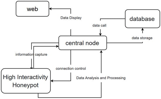 In this paper, the high-interactivity honeypot system borrows the structure of the kernel-based operating system and adopts a modular design to complete the central node part of the high-interactivity honeypot system. The modular design is advantageous in several ways. Firstly, it enables team division of labor and cooperation, allowing team members to clearly understand their own work content. Secondly, it is more conducive to system debugging during the development stage, allowing targeted modification of a part of the system without modifying the entire system. Finally, the modular design is beneficial for adding or deleting functions based on the original system. The system has a central node serving as the connection node and information processing center for various high-interactivity honeypots. Based on the central node, the main components of the high-interactivity honeypot system framework are divided into information capture, connection control, honeypot deployment, data analysis and processing, and data storage. The operational structure of each part of the framework is shown in Figure 1.
