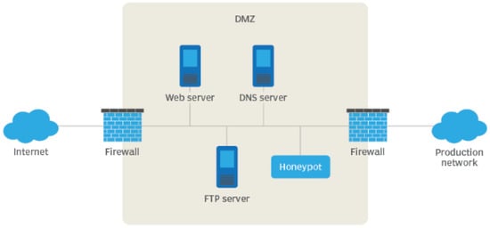 - Mairh, A.; Barik, D.; Verma, K.; Jena, D. Honeypot in network security: A survey. In Proceedings of the 2011 International Conference on Communication, Computing & Security (ICCCS ’11), Rourkela, Odisha, India, 12–14 February 2011; Association for Computing Machinery: New York, NY, USA, 2011; pp. 600–605. [Google Scholar]