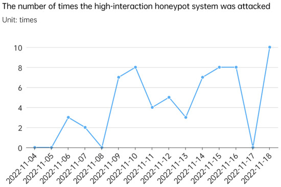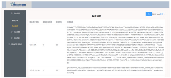 In this highly interactive honeypot system, the honeypot can accurately collect the IP address of the attacker, the number of times the attacker uses the IP address to attack the honeypot, and the score of the attack, when an attacker attacks. These details can help in determining the threat posed by the attacker and the target. Furthermore, the attacker’s springboard machine, meat machine, and even the attacker himself can be tracked through the IP address. Additionally, the honeypot provides some details about the attacker, such as the cookie used by the attacker, the operating system information used by the attacker, the attacker’s browser information, and the time of the attack. By analyzing these details, users can develop insights about the identity and behavior model of the attacker and provide some help for attack countermeasures. The information collected is shown in Table 2.