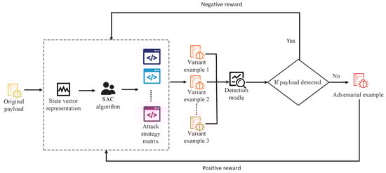 - SQL injection adversarial attack method: We proposed an adversarial attack method based on the soft actor–critic (SAC) algorithm, in which the agent adapted the attack strategy to generate adversarial examples based on the feedback from the detection model.