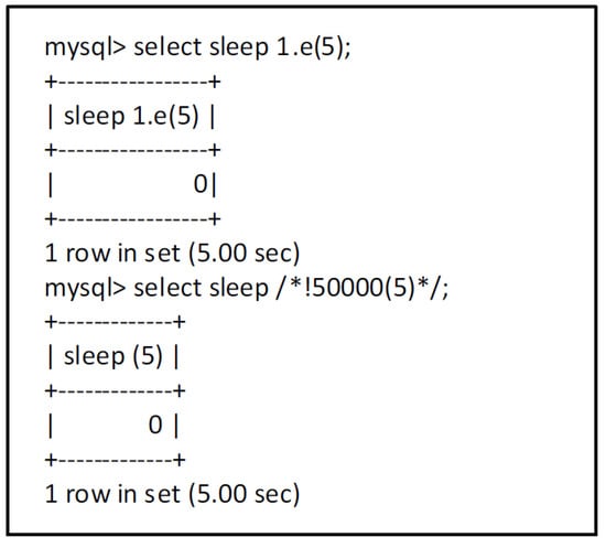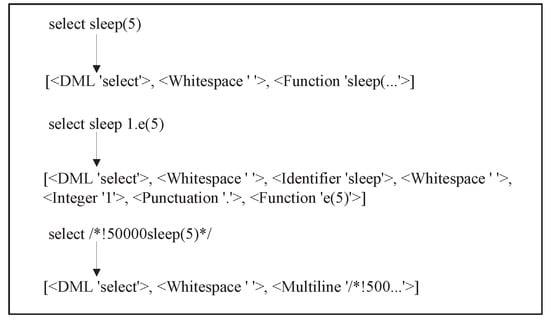 The results of MySQL executions A and B are shown in Figure 4, and we observed that although they were not identical, they had produced the same results. Furthermore, as shown in Figure 5, three lines of code with the same execution result had been parsed by the libinjection library as significantly different syntactic units. The semantic interference strategies could interfere with semantic-analysis-based detection methods and cause changes in the structure and content of the code without affecting the execution results.