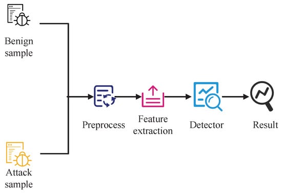 The semantic-analysis-interference strategy was used primarily for natural language-processing-based methods for SQL injection detection. Such detectors typically serialize attack examples, map the text to word vectors via word-embedding models, and then use downstream deep-learning algorithms for prediction. Relevant learning algorithms, such as CNNs, can extract key features from the text, or others, such as LSTM, can analyze the contextual structure to obtain the text state. As shown in Figure 6, the general detection model framework consisted of three parts: preprocessing, feature extraction, and a classifier model. Therefore, in order to bypass the natural language-processing-based detector, our concept involved adding normal features and obscure attack features to the example.